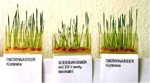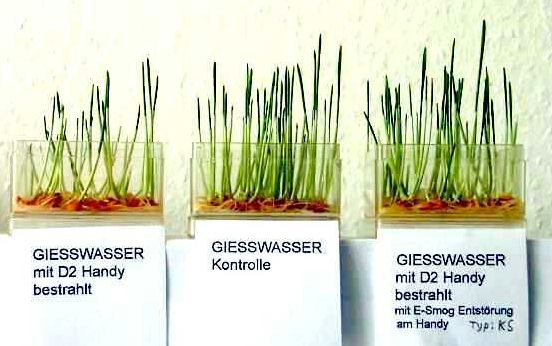 Dazu wurden Weizenkörner mit Leitungswasser zum Keimen gebracht, das vorher mit einem Mobiltelefon für 1 Minute bestrahlt worden war und deren Wachstum verglichen mit einer Probe von Körnern, die mit unbehandeltem Leitungswasser zum Keimen gebracht wurden. Die Probe mit bestrahltem Wasser wuchs eindeutig schlechter. Solche Versuche haben andere Forscher ebenfalls gemacht. Prof. Klima in Wien und Prof. Kröplin in Stuttgart und mit ähnlichen Ergebnissen. Solche Versuche lassen sich selbst von Laien leicht nachmachen. Es müssen allerdings ein paar Details dabei beachtet werden, die vom Autor an Interessierte gern weitergegeben werden.