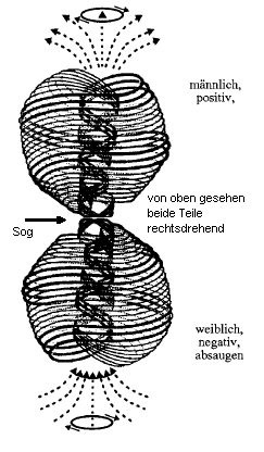 Das folgende Bild könnte eine Kombination sein, die dem Torkado ähnelt, der im drehungsfreien Fall auftreten würde. Da sich alles dreht in der Welt, 'zerbricht' er im realen Leben, weil Tief und Hoch verschiedene Drehrichtungen haben müssten. Durch das Umklappen einer Hälfte wird dies ermöglicht, was gleichzeitig einer elektrischen (rein,raus) und magnetischen (rechts-,linksherum) Dipolbildung gleichkommt.