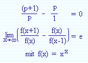 Diese Ähnlichkeit hebt die x^x-Funktion heraus aus der gegenwärtigen Bedeutungslosigkeit. Sie ist eine besondere Funktion, die die bekannte wichtige Naturkonstante e an jeder Stelle als Grenzwert generiert, und zwar über eine Gleichung, bei der die Funktion x^x als Verallgemeinerung der irrationalsten Zahl die es gibt (Kettenbruch p=(1,1,1,1,..)), gesehen werden kann.