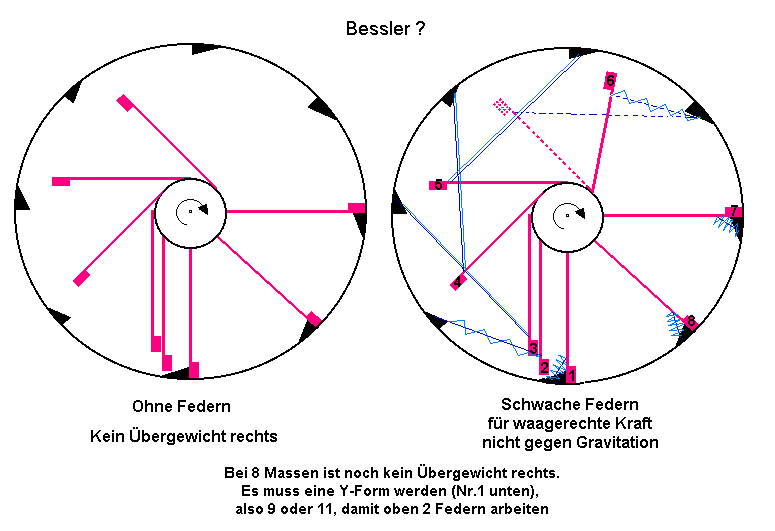 Falls Bessler nur 8 Gewichte hatte, müssen die Federn recht stark gewesen sein, um auch noch Gewicht 5 nach vorwärts zu klappen - ohne das unten genauso zu machen.>Man darf die Pendel, die außen am Bessler-Rad angebracht sind, nicht außer Acht lassen. Ich selber vermute das diese nicht wirklich hin und her schwingen sondern sets einen gewissen gegendruck erzeugen sollen,