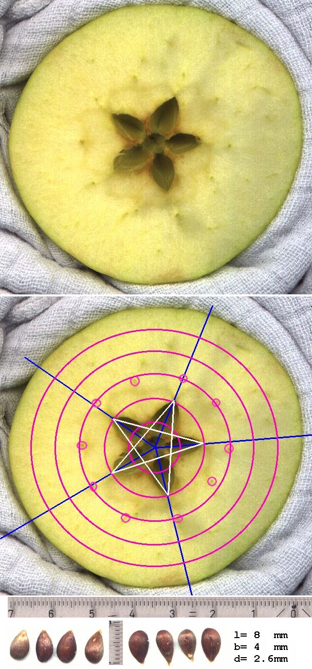 Dies zunächst nur zur Demonstration, daß es außer dem 2^N-Oktavgesetz mit Sicherheit (mindestens) auch ein 3^N-Gesetz geben muß. Das Kerngehäuse hat 1/3 Größe des Apfels, weitere Strukturen bei 1/6.
