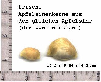 Bei genaueren Messungen wird man vermutlich sehen, daß die Skala immer bis zur Pflanzenzelle nach unten geht. Ich erkenne in der safttragenden Apfelsinenstruktur die Körnergrößen der Getreidesamen wieder.Hier noch die einzigen beiden Kerne von Apfelsine 4, die anderen waren kernlos: