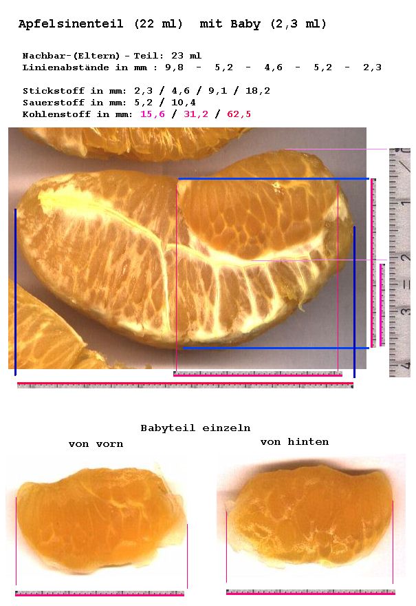 Erst mal das Gesamtvolumen. Es nimmt zu, wenn man die Apfelsine teilt: Das berechnete Kugelvolumen, von den gemessenen Durchmessern (ohne Schale) ausgehend, ist kleiner als das Summenvolumen der Teile (2 bis 5%).