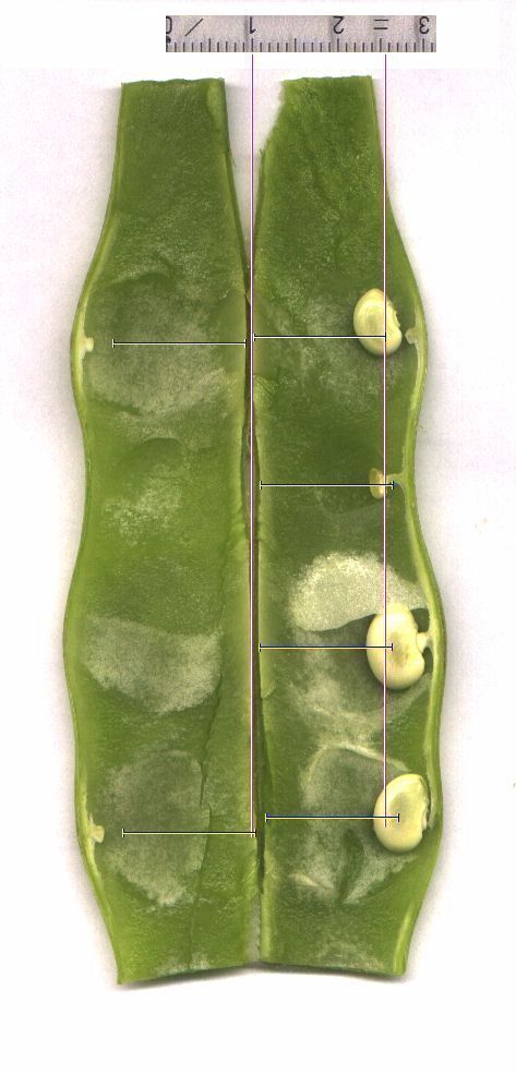 Die zweite Bohne liegt im falschen Kurvenbogen, ihr Abstand zur Außenwand war zu gering, so daß sie zwar am Anfang etwas gewachsen ist, dann aber mit ihrem Bohnenkörper nichts mehr einfangen konnte, weil immer nur die Verankerung getroffen wird. Sie ist klitzeklein geblieben, aus Energiemangel verkümmert.
