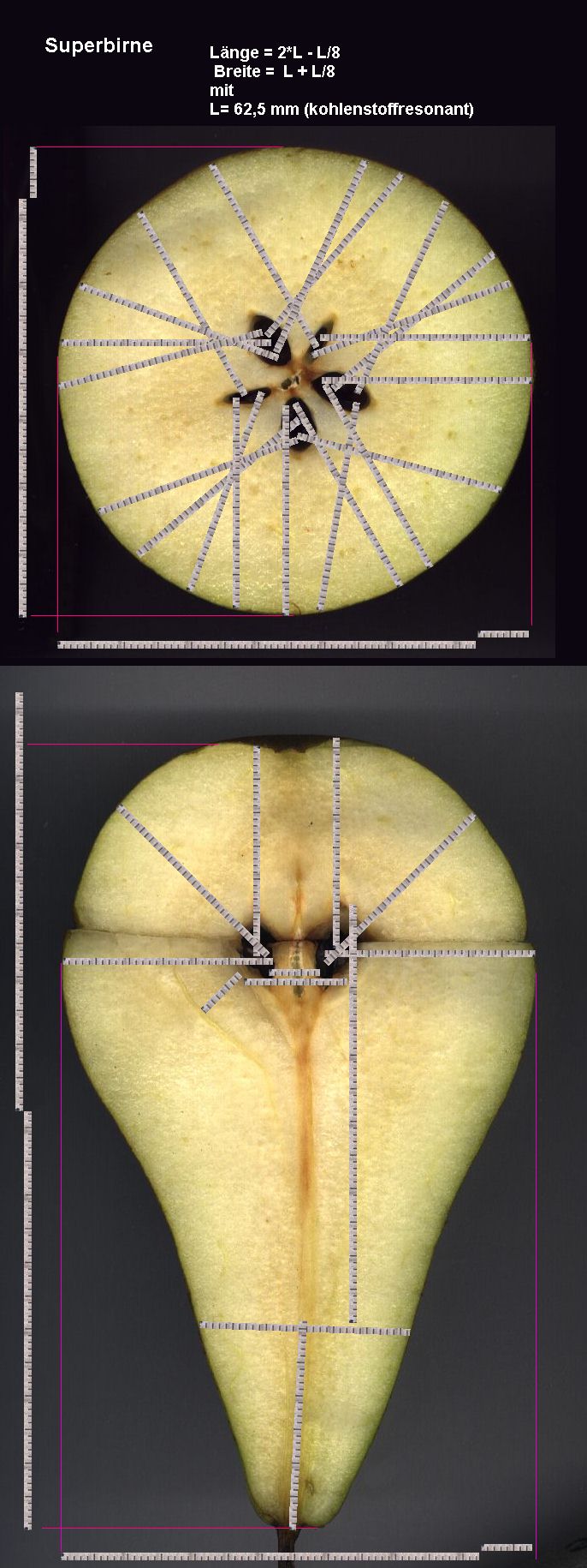Als 9. Birne, die ich gemessen und gescannt habe, fand ich diese. Hier paßt so gut wie alles, sogar die dünnen Kerne haben gute Karten, doch wenn die anderen bessere Karten haben, nützt ihnen das wenig, denn die Energiesumme in der Birne ist konstant.