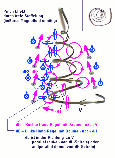 E-Linien sind Teilchenbahnen der Subteilchen, mal außen (weniger heiß) transversal und wenig longitudinal, mal innen (heiß) sehr wenig transversal und viel anti-longitudinal (besser vorzustellen in der Schlauchwand, siehe http://www.aladin24.de/htm/images/R-Torkado.gif , bei Spiralen ist die Sichtweise austauschbar, je nach Steilheit.). Der sehr heiße Innenschlauch ist mit einem sehr kalten/leeren Spiralen-Innenraum verbunden, der in Gegenrichtung weist. Auf dem Bild