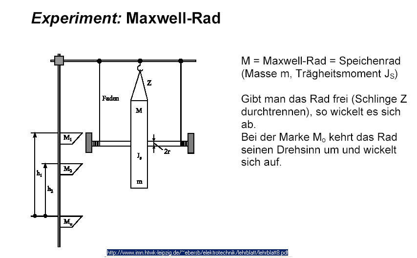 >Wer in der Schule Physik hatte ist wahrscheinlich dem berühmten Maxwell-Rad begegnet. Falls nicht: Es handelt sich um ein besonders verlustarmes, bifilar aufgehängtes Jojo mit ziemlichem Trägheitsmoment, das sehr lange läuft und anfangs auch praktisch fast bis zur Starthöhe zurückkehrt; ein sehr flexibles und somit beliebtes Prüfungsthema.>Die Bilder oben zeigen nun eine Variante dieses Teils mit rotationsabhängigem Trägheitsmoment, realisiert mittels federbelasteter Hebel an denen die Massen montiert sind. Die Funktion ist wohl unschwer aus den Abbildungen zu entnehmen. Die Hebelmechanik kann auch gesperrt werden, dann haben wir das klassische Maxwell-Rad.