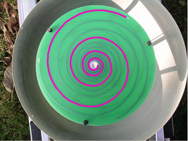 >In der Draufsicht (Lila von mir eingetragen) sieht man, wie in der Platte die zweite Spiralengruppe (scheint durch) in die Gegenrichtung zeigt. Wenn es aber einmal von außen nach innen und dann von innen nach außen geht, dann ist es die gleiche Drehrichtung.